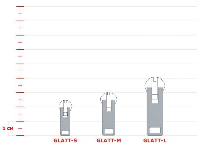 The GLATT is a rectangular zipper puller characterized by a sleek, minimalist metal design with geometric cutouts. It is available in small, medium, and large dimensions.